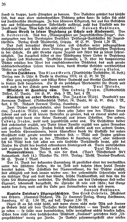| Rez. in Quickborn: | P. Wriede in: Quickborn Jg. 13, S. 26 |