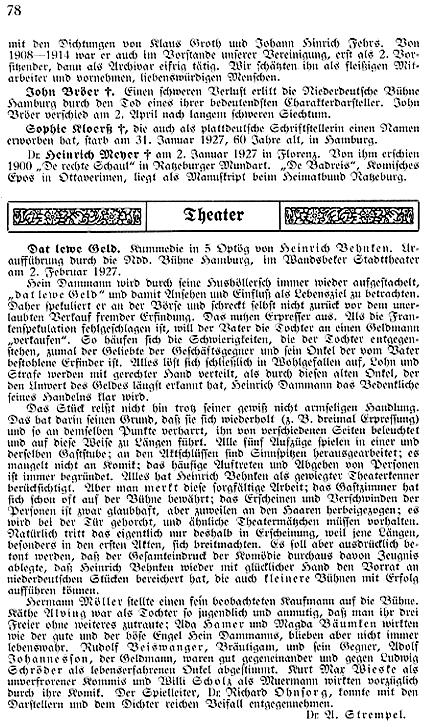| Gesamttitel | Speeldeel [SP] ; 21-23 | Aufführung | UA: Niederdeutsche Bühne Hamburg, 02.02.1927 |