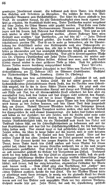 | Sek.-Lit.; Rez. | Lindemann in: Niedersachsen 27 (1921), S. 113; P. Jessen in: Modersprak 8 (1921), S. 47; Niedersachsenbuch 6 (1922), S. 143. | Aufführung | UA: Niederdeutsche Bühne Hamburg, 22.02.1921 |