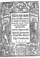 | Titelblatt | Wat me van dem Closter levende holden schal, allermeyst vor de Nunnen unde Bagynen gheschreven: Uth der hilgen schrifft / Dorch Joannem Bugenha. Pome. Tho Hamborch |