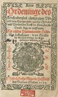 | Titelblatt | Korte|| Ordeninge des|| Kerckendenstes/ : sampt einer Võr=||rede van Ceremonien/ an den Ehrbarn|| vnd Wolweisen Rath der Königlichen|| Stadt Riga in Liefflandt.|| Mit etliken Psalmen vnde Gödt=||liken Loffgesengen/ de yn Christli=||ker Vorsammlinge tho Riga|| gesungen werden. (Etlike Psalmen || vnde Geistlike Leder/ so || in der Rigeschen Ordeninge || nicht gedrücket syn.||) |