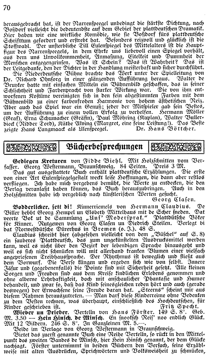 | Sek.-Lit.; Rez. | Moderspraak 12, 1925, S. 32; De Lücht 1930, S. 35; Niedersachsenbuch 8/9, 1924/25, S. 170; Niedersachsen 30, 1925, S. ?; Heimat 34, 1924, S. 298 (G. F. Meyer. |