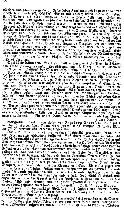 | Sek.-Lit.; Rez. | M. Sch. in: Der Schimmelreiter 2 (1920), S. 58; Niedersachsenbuch 6 1922), S. 142 | Aufführung | UA: Niederdeutsche Bühne Lübeck, 07.11.1920 |