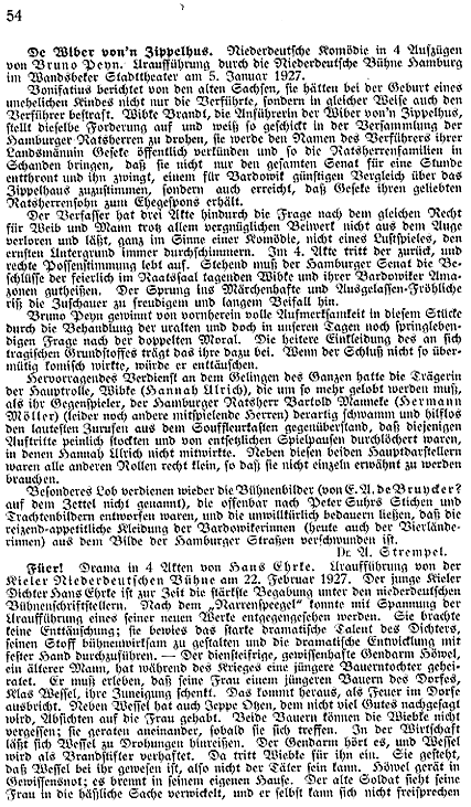 | Sek.-Lit.; Rez. | G. F. Meyer in: HE 37,1927,272. - K. Bink in: QU 21,1927/28,123. | Aufführung | UA: Niederdeutsche Bühne Kiel, 22.02.1927 |